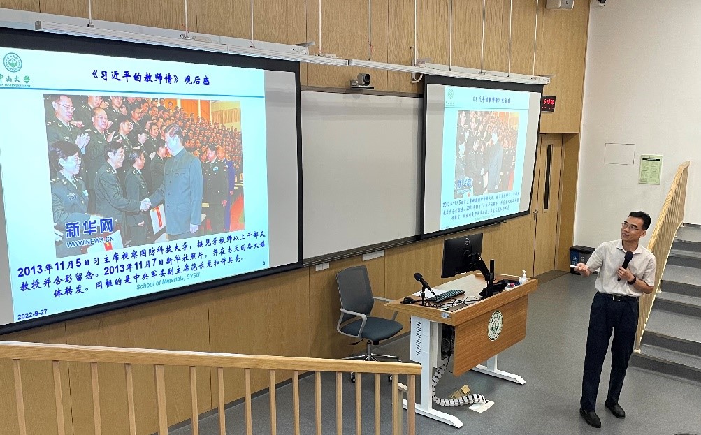 座谈会一开始,江大志教授深情地分享了他观看《习近平的教师情》专题片的观后感。他说,习近平总书记从国家教育事业、好教师标准、教师与教育的关系、教师与人才培养的关系等方面多次做出重要指示批示,可见教育和教师在习近平总书记、在党中央心中的分量!他说他看了三遍专题片,看完后深受教育和感染,更感到自己使命光荣、责任重大,并为自己曾经是一名军人,现在是一名人民教师感到无比自豪。