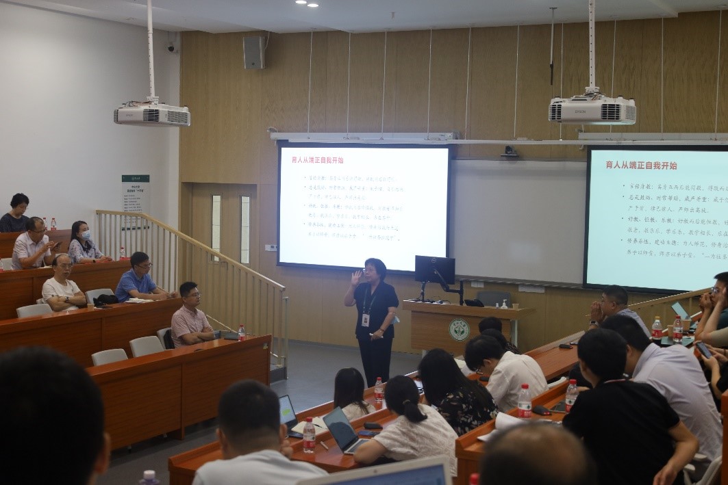 接着,学院围绕“迎接党的二十大 培根铸魂育新人”主题,针对师德师风第一标准要求,开展师德建设主题教育活动,邀请中山大学卓越教学名师、中山大学医学院周丽华教授作题为“教书育人,从丰富自我开始”专题报告。周老师以自身30多年的教学经历,分享高校教师如何在教育教学中实现教学相长,并对做好人才培养阐述了三方面感受:一是为师之道,唯知识为尊;二是为师之责,传道授业解惑之责任;三是为师之求,培养学生崇高理想和全面素养。周老师强调,教书育人,首先从端正自我开始,言传身教,自身正而后能得敬,得敬而后能得信。