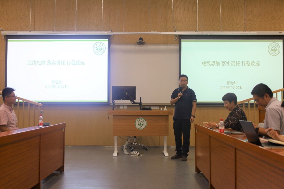 最后,曹发和院长助理作题为“底线思维,落实责任,行稳致远”实验室安全管理工作的主题发言。他介绍了学院实验室安全管理制度的建设情况、典型隐患以及相应的整改措施。他希望老师们高度重视实验室安全管理工作,认真学习实验室管理的相关制度文件,切实承担起安全责任,杜绝安全隐患。