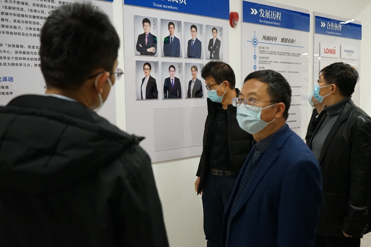 在可持续光电技术研究实验室,高平奇教授细致介绍了团队在高效低成本太阳电池技术方向的布局,紧紧围绕“效率可持续、材料可持续、环境可持续、能量输出可持续”四个维度来开展基础科学与应用创新研究,近两年来团队负责人主持了国家基金重点项目、国家重点研发计划项目、逾千万元横向课题等。高松校长随后参观了超净实验室,详细了解了设备国产化的问题,对团队能在较短时间内建设成较为系统的从制备到表征的基本条件,快速形成服务国家重大战略的能力和搭建产学研融合发展的构架表示赞许。高校长还详细询问了团队在人才引育、基础保障等方面的情况。
