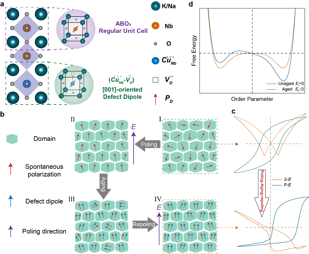 高性能压电材料是研制新一代智能感知器件和精密驱动器件的关键。其中,铌酸钾钠基无铅压电陶瓷被认为是未来替代铅基压电材料的有力候选者。然而,传统无铅压电陶瓷材料存在电致应变较小(通常低于0.3%)和温度稳定性较差等问题,限制了其实际应用。近年来研究发现,缺陷偶极子对压电陶瓷的电学性能具有显著影响:一方面,缺陷偶极子可以通过钉扎效应抑制畴壁运动;另一方面,缺陷偶极子在电场下会产生显著响应。通过缺陷偶极子的拉伸实现超高的电致应变在近年来被广泛报道。然而,关于缺陷偶极子的形成机制及其与压电材料性能的关系仍未完全阐明;通过缺陷偶极子的设计,开发高性能的压电材料已成为研究的热点之一。