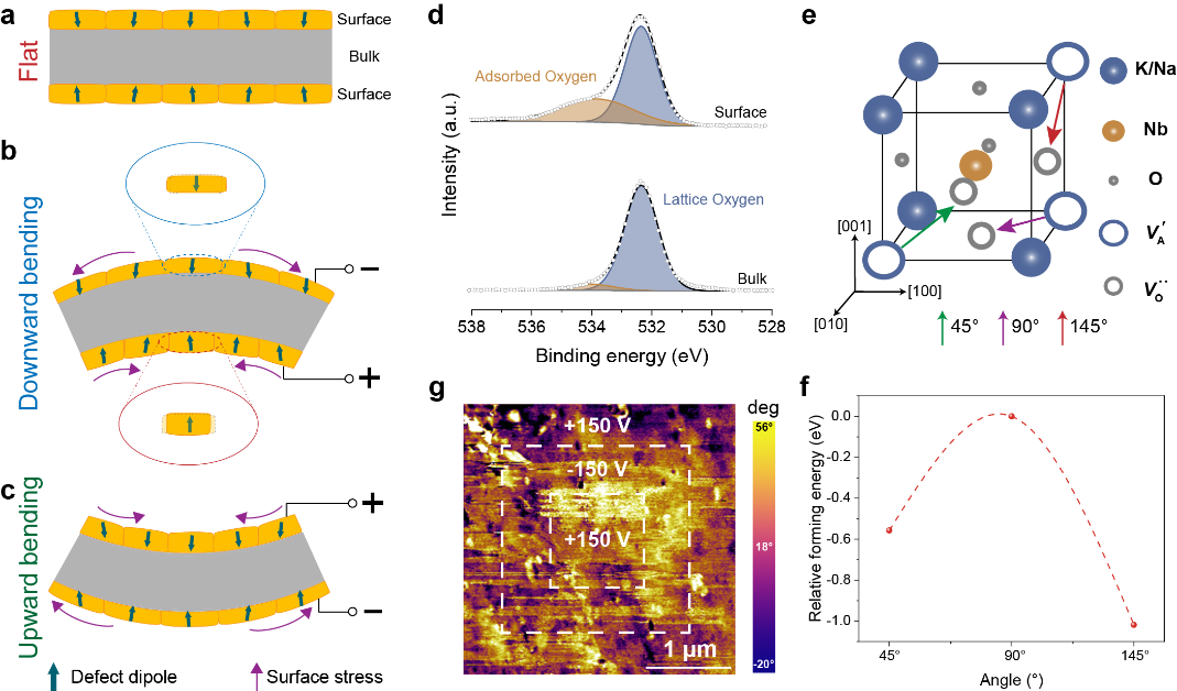 在上述研究的基础上,为了探讨表观电致应变的厚度依赖性,研究团队创新性地引入激光扫描测振技术,首次直接观察到了薄KNN陶瓷样品在电场下的实时形变行为。令人惊讶的是,陶瓷在电场下并未出现传统的均匀拉伸变形,而是表现出一种新颖的弯曲变形。在交变电场下,陶瓷显示出不同方向的交替弯曲(可控凸-凹变形)。通过分析,研究团队发现缺陷偶极子在陶瓷表面层更易于形成,且取向朝内的缺陷偶极子具有较低的缺陷形成能,趋向于朝向陶瓷内部。因此,表面层缺陷偶极子在外电场下产生的不对称响应所造成的应力差异,从而引发了陶瓷的弯曲。这种弯曲变形是所观察到的大表观应变的原因,揭示了超高电致应变的物理本质。